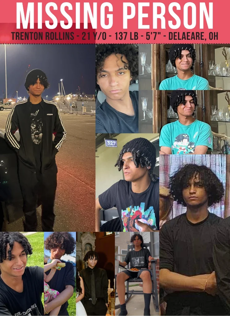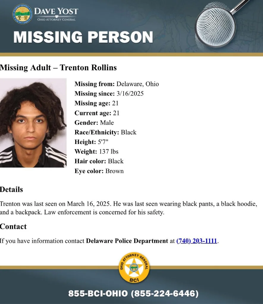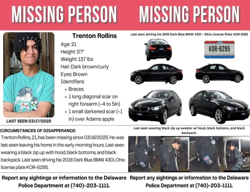 Trenton Rollins, 21, has been missing since Sunday, March 16th, 2025. He was last seen leaving his home in the early morning hours. We beg everyone to please stay vigilant and report any sightings or information to the Delaware Police Department at (740)-203-1111.