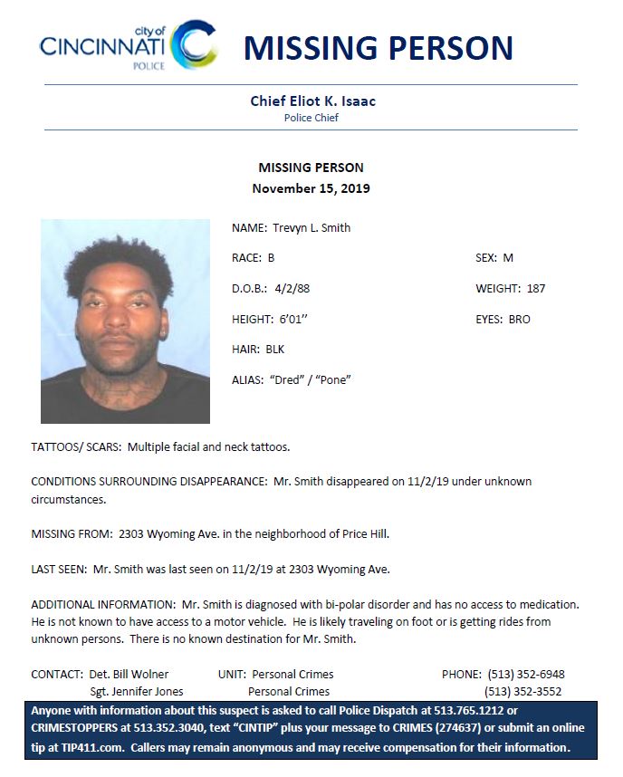 Trevyn Smith, 31, was last seen on Nov. 11. Smith is bipolar and doesn't have access to his medication. He was last seen on Wyoming Avenue in the Price Hill area.
