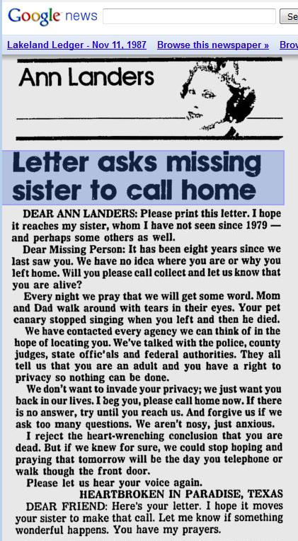 The family of a woman who went missing from Paradise, Texas in 1979 wrote to Ann Landers in 1987 asking her to print a plea for their loved one to come home. Names were not used, but I wonder if we can track it down and see if we can find a name and if this person is still missing? It looks like Paradise, TX could fall into our isotope area.