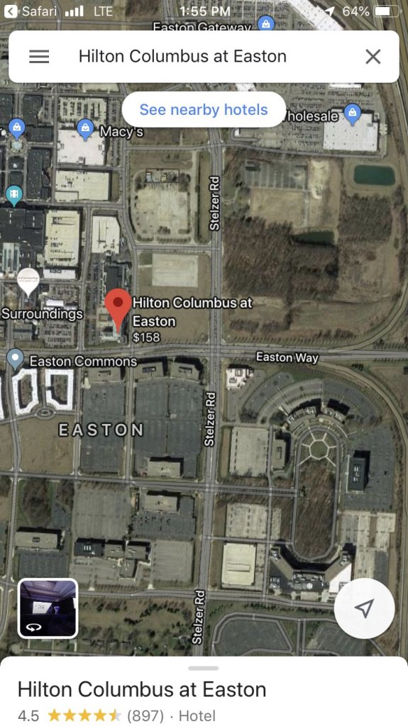 I’ve never posted a picture here before, so hopefully this works. The only woods he’d be able to see the Hilton from would be east (there are bigger woods NW on Morse Rd and NE on Sunbury Rd, but you can’t see the hotel or Easton in general from there). He’d have to cross Stelzer Rd which wouldn’t be very busy at that time. The woody area to the north of the Hilton on the map is no longer there. It wouldn’t have been there a month ago, either. They’re expanding the mall with more shops and restaurants. 270 goes around the city of Columbus, but 71 cuts right through the state and is just a few mins north of this area on 270 (a little further if you go south).