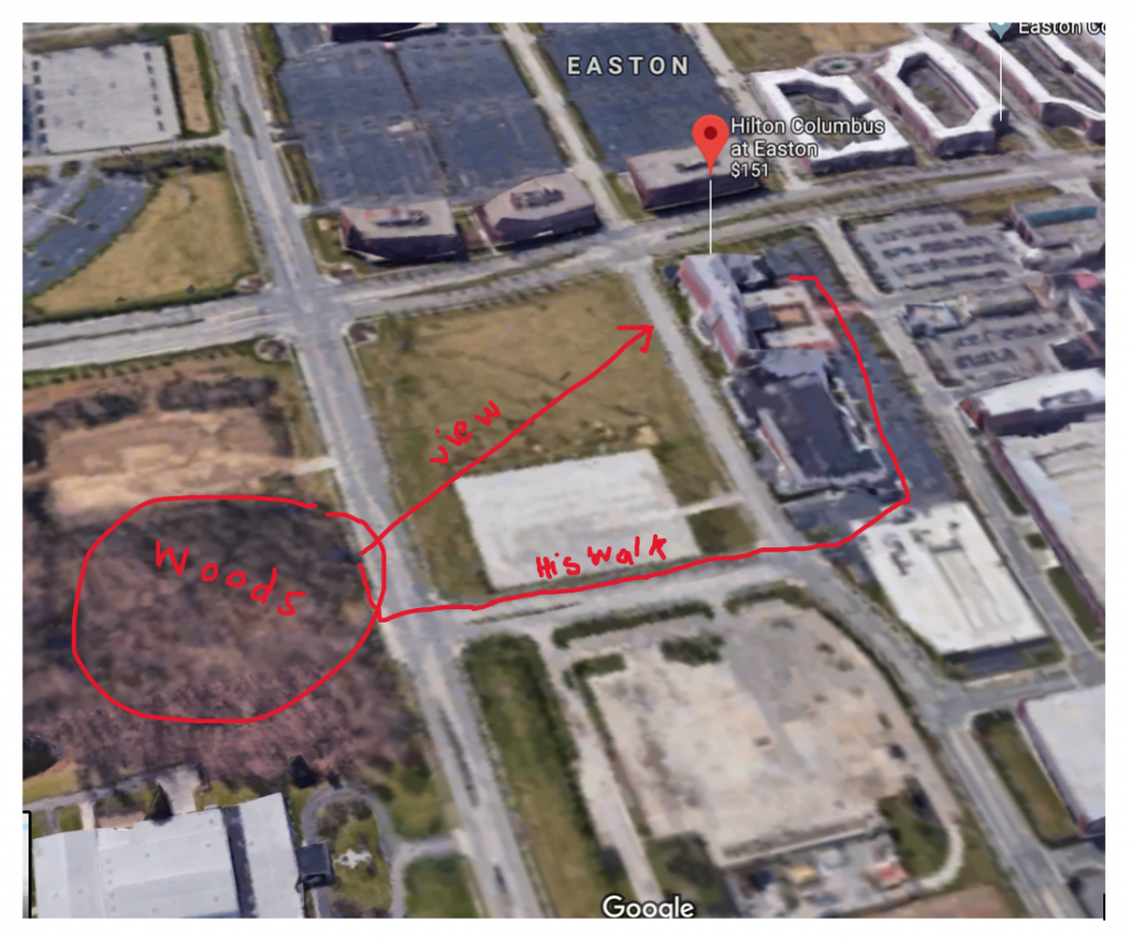 If you do the street view and follow my path (attached) you can see how his view would be exactly of the hilton from these woods. And it does not seem like a difficult walk to get here, even though you cross a couple roads.