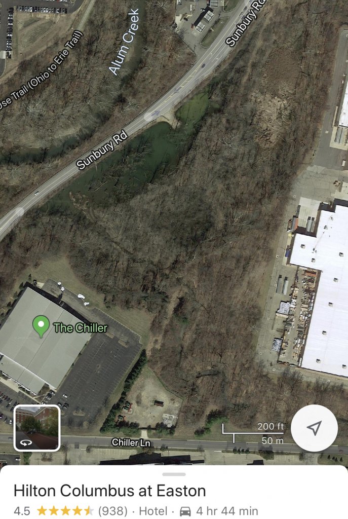 Edited to add: Although...if he walked west on Easton Way, he would come to Sunbury Road in about a mile (with sidewalk available all the way I believe). Soccer fields are across the road and Alum Creek is just beyond the fields. That is a wooded area with a flow of water relatively close to the Hilton.