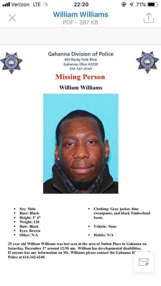 26-year-old William Williams was last seen on Sutton Place Drive around 12:50 a.m. Williams suffers from a mental illness and are concerned for his safety. He was last seen wearing a gray jacket, blue sweatpants and black Timberland boots. Williams is 5'6" and weighs 120 pounds. He has black hair and brown eyes.