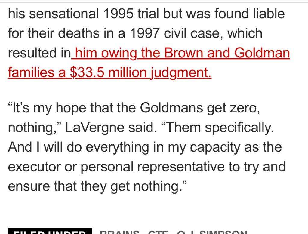 I can’t believe how much possessions and money OJ has kept away from satisfying the judgement of 33 millions the Goldmans and Brown family won in the civil case.