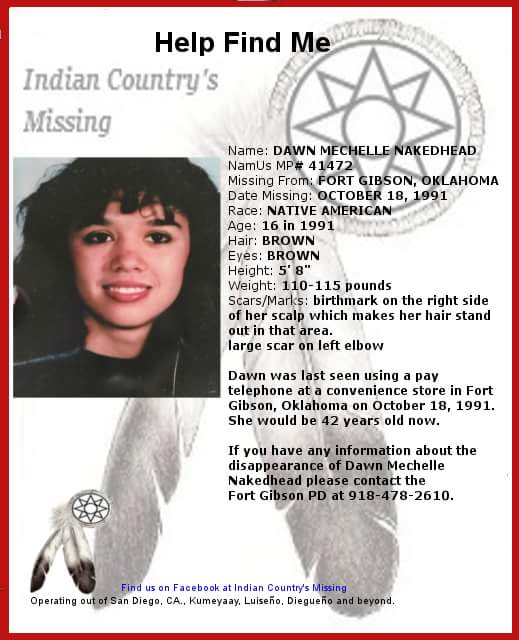 Dawn Nakedhead went to spend the night with a friend. They planned to attend a football game and then return home. Dawn was last seen using a pay telephone at a convenience store in Fort Gibson. Oklahoma. She never returned home.