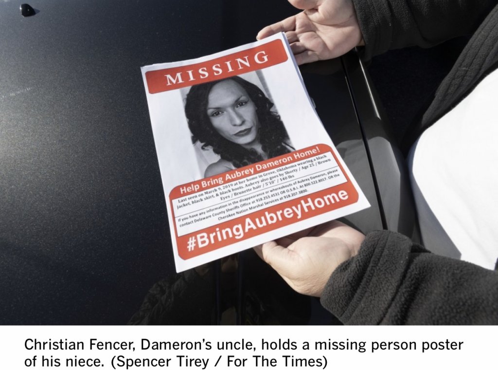 Since Dameron disappeared from her northeast Oklahoma home nearly a year ago, her aunt, Pam Smith, has plastered dozens of placards around town. She has also organized search teams to scour fields and to drain a pond. And she has repeatedly pleaded for information in Facebook posts.