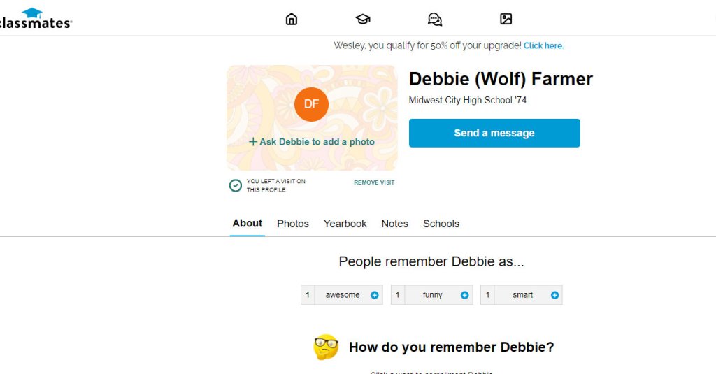 Alright everyone, I am going to share what I have at this time and give a little bit of info on each bit. First up, the Debra *** Farmer issue. This is the source. I assumed that Ms. Farmer likely had attended MWC Highschool, and someone suggested someone that looked like a possibility. I went back and made a list of all Deborah, Debbie, and variants from '71 to '75 . Then I checked Classmates.com the name. . this is what came up.