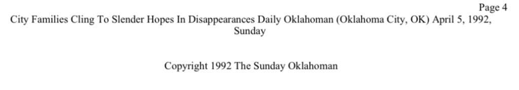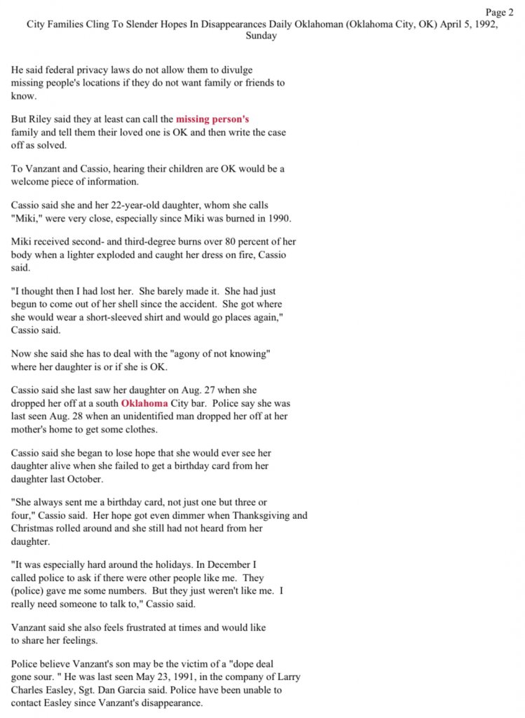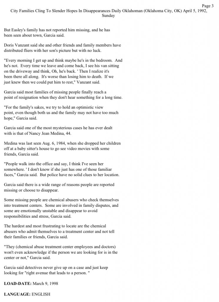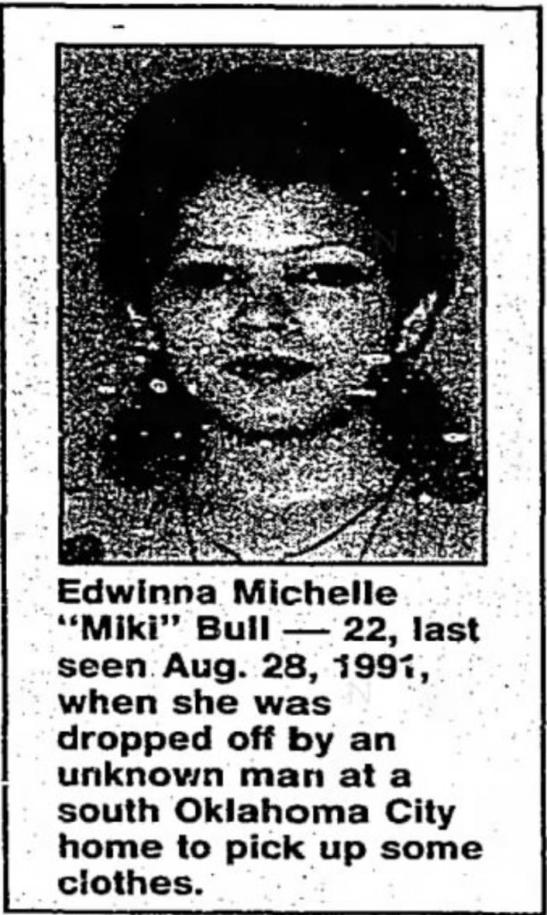 Circumstances of Disappearance: Mother states that she last saw her daughter on August 27, 1991 when she dropped her off at a south Oklahoma City bar. Police say she was last seen August 28, 1991 when an unidentified man dropped her off at her mother's home to get some clothes.