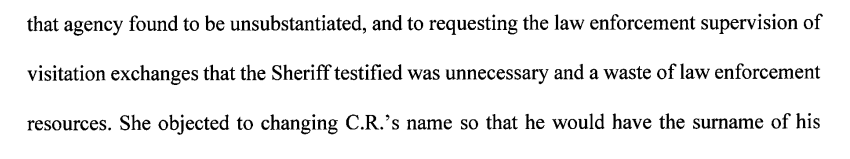 I posted earlier a screenshot of part of the brief filed by Wrangler's lawyer in support of Wrangler's request for sole custody, where a Sheriff Berguetski said that they would no longer be supervising the child exchange despite VB's request, because they had deemed this unnecessary since they'd never seen anything in the exchanges that caused them any concern. There was one other place in the documents where this was brought up again, and this time, he even added that they quit supervising because it was a WASTE OF POLICE RESOURCES! This is so outrageous and so obtuse that it makes me wonder if this officer was complicit in any way! Here's a screenshot: View attachment 497713