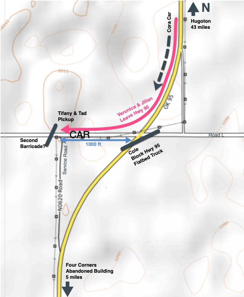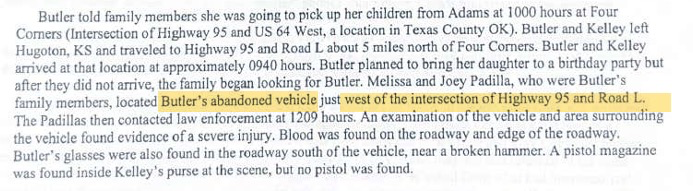 Third car. That makes it easier. Makes sense. Hadn't thought of that.Pretty much agree with your logic except I think Cole and Cora were the lookout and diverter. (Cora was the sentry and called Cole when she saw VB & JK and if there was no other traffic, she followed the victims) They (Cole and Cora) each had a phone so one was the lookout and one blocked the road and when VB and JK turned off the road there was TA, TC and mysterious PG as perp #5. Like you said then Cora and Cole followed them and closed the trap. JMO