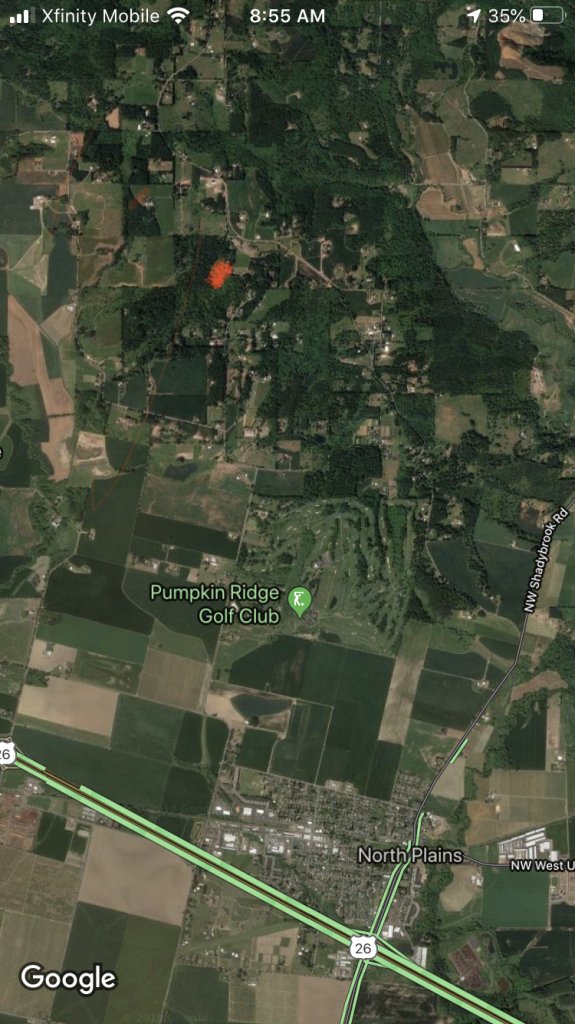 This screenshot shows the city of North Plains, and I added the red dot at the top that marks where Ben was reported to be found sleeping in the truck. It is about 3-4 miles north of North Plains
