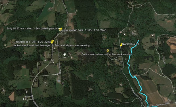 I was told they showed up at the fire station on 25th in Hillsboro and told them - asked to use the phone. He called his mom. They said they were robbed at knifepoint. The firemen said 'well you do want us to call the police?' Ben's like 'No!' - they call his mom, she said 'ok I'll come get you' but the fire station guys are like 'something's not right here' so they call the police. Police hows up exactly when MG (Ben's mom) shows up and they're trying to talk to them (Ben and Allyson) and Allyson's like 'no we're fine everything is ok'