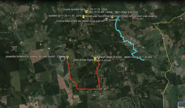 According to Misty, the witness described him as soaking wet, shaved head, acting strange and carrying a bunch of clothes with no shoes. No explanation given for why this witness didn't stop to help him and waited so long to come forward. (witness contacted Allyson's aunt, not LE). He would have had to walk north to where he found the truck to sleep in, placing him there around 7am-8am or later. Look at the map to see how convoluted it would be to walk.