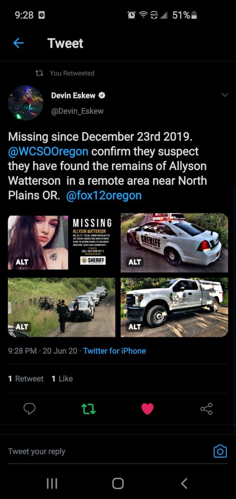 Detectives responded to the scene to assist with the investigation. Based on the location of the remains and evidence found at the scene, detectives suspect the remains are those of Allyson Watterson. Ms. Watterson has been missing since December 2019. The Washington County Medical Examiner’s Office will work to identify the remains.