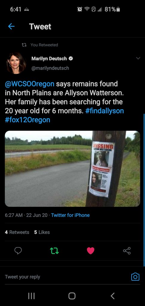 @WCSOOregon⁩ says remains found in North Plains are Allyson Watterson. Her family has been searching for the 20 year old for 6 months. #findallyson #fox12Oregon https://t.co/6rooOZMs6D