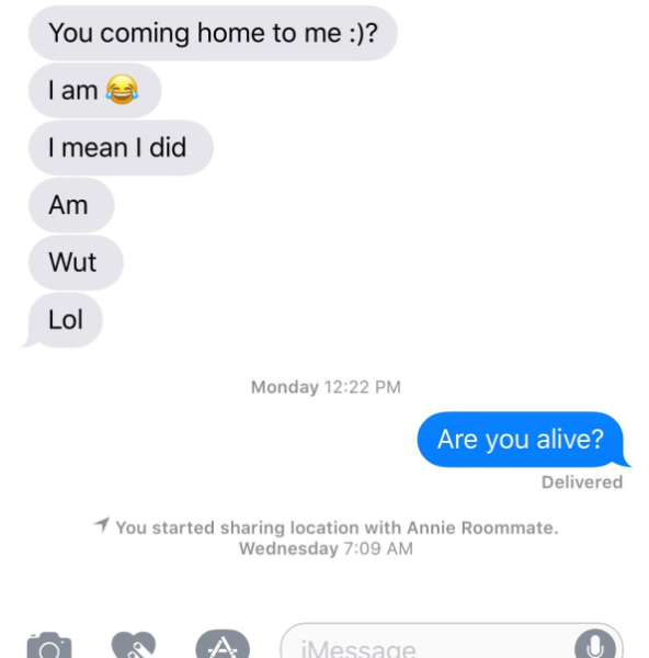 In looking at Annie's last text to roommate, it asks "are you coming home to me?" Then she responds to herself "I am." That's simply bizarre. Makes you think someone was confused about which account they were sending texts to/from on. Where are the responses from the roommate for that strange text string? "Are you alive?" doesn't seem to fit in.