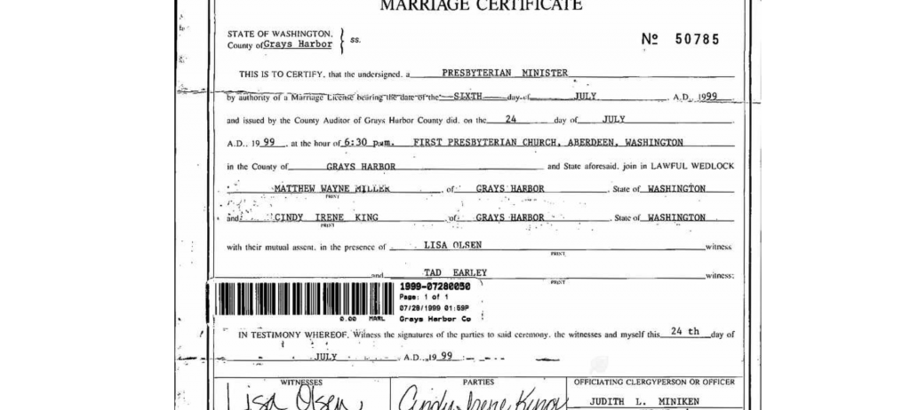 Don’t believe this is her.One interesting question is 'how many Cindy Irene King's' lived in the NW? I ask the question because I am attaching a picture of a marriage record from 1999 between Cindy Irene King and Matthew Wayne Miller, both of Grays Harbour. It comes from Ancestry and is indisputable as it is the original certificate. I cannot explain it except if there was a second Cindy Irene King in the same wider area, and I cannot find a record for another.View attachment 355155