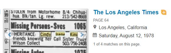 I couldn't find any archived mention of Cindy's disappearance online, and COVID interrupted my ability to snoop at the local libraries and whatnot to see if any hard copies of past editions of local papers exist from around that time... but that doesn't mean I'm giving up on this one. Josephine County has a pretty large amount of missing people despite the fact that it's a relatively small area. Somebody out here has to remember her.There is not much out there on Cindy. I did come across a 1978 newspaper clipping posted in Los Angeles.