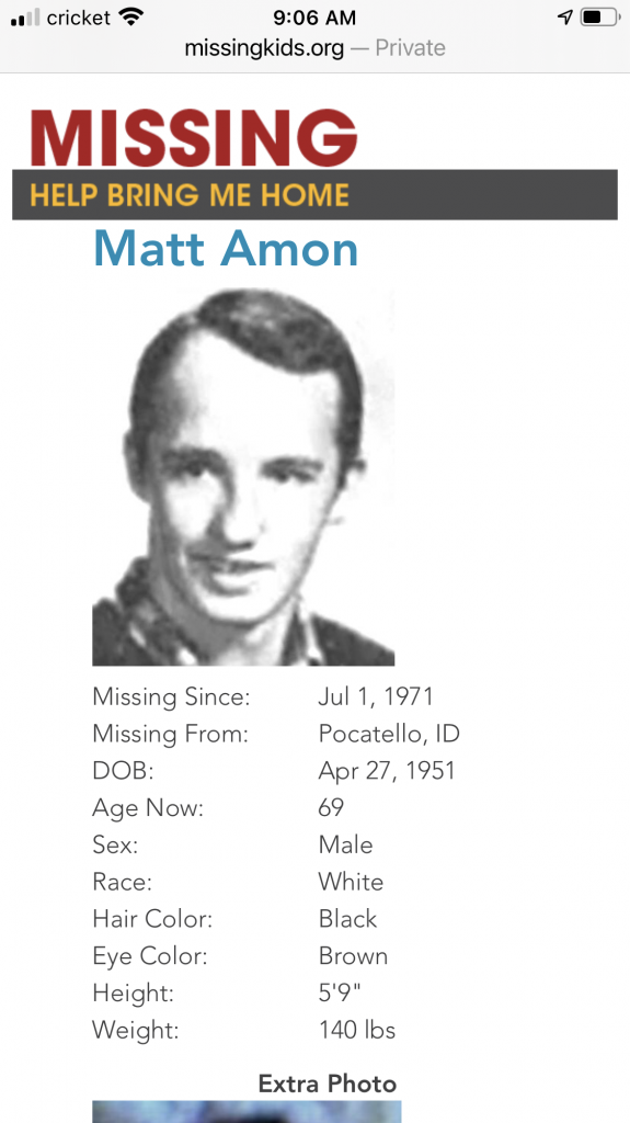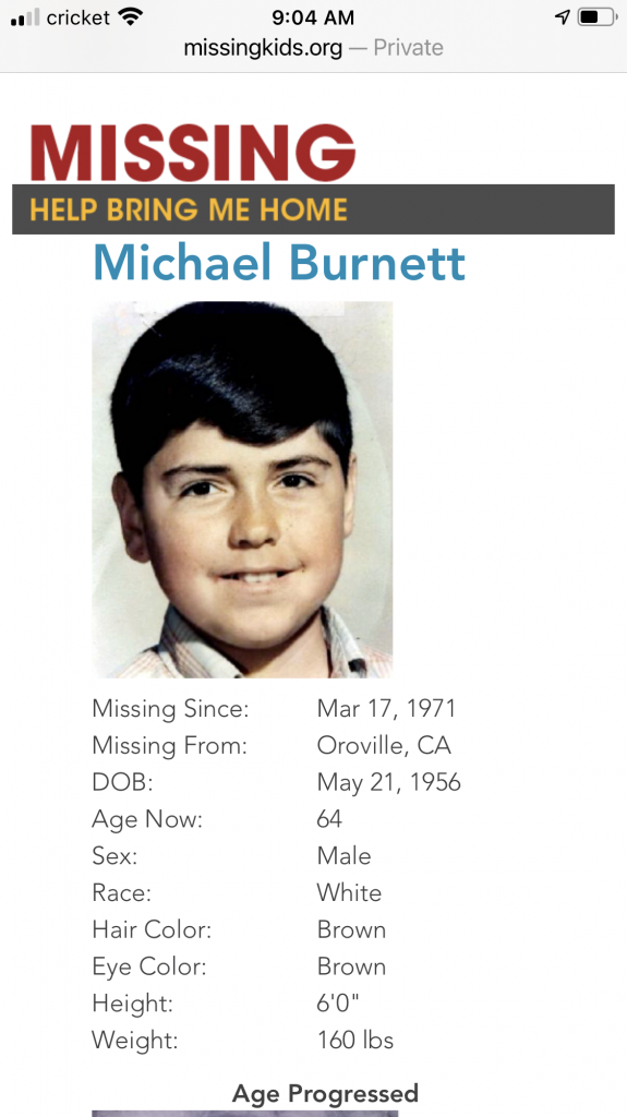 14 years old. Missing from Oroville, California since March 1971. 6’0” (awfully tall seems like), 160 lbs., brown hair and eyes. He also previously had a lung removed and surgery scars so I’m sure that, and the height, would rule him out.