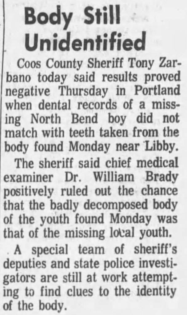 21 year old Alaskan native presumably lost at sea since April 24, 1971. 5’3”, 140 lbs. dark hair & hazel eyes. Not sure if it’s even possible he could have made it across the ocean and up the Coquille River?