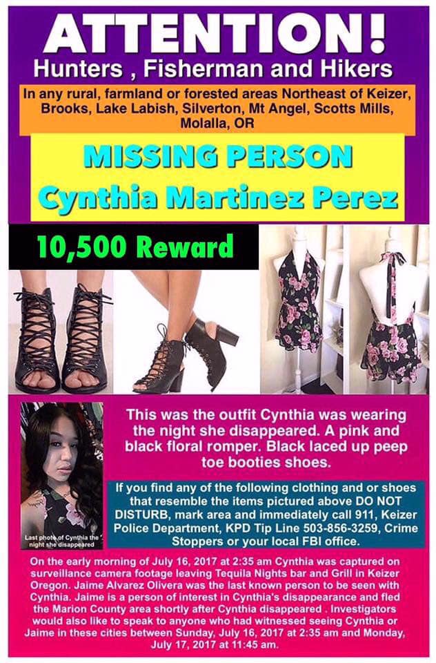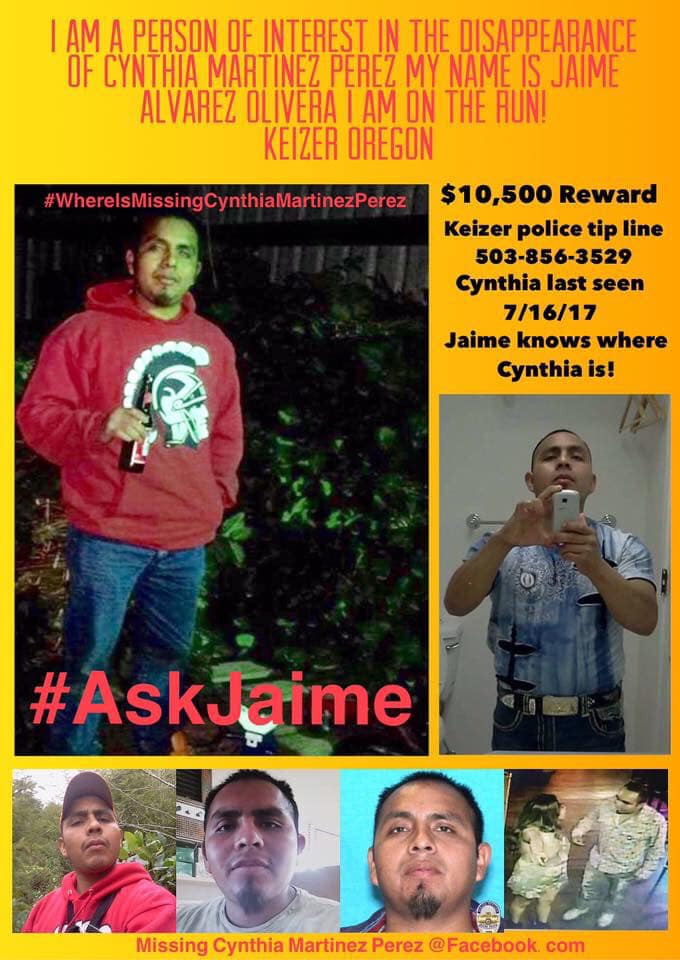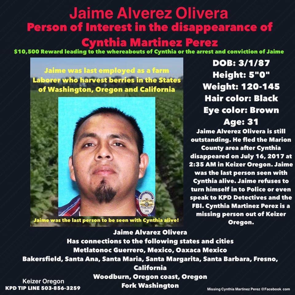 Alvarez-Olivera “was last thought to reside in the Woodburn area, however investigators have not been able to determine exactly where he resided or with whom prior to July 16th.” However, “Alvarez-Olivera is believed to have left the Marion County area on Sunday, July 16th, a short time after Cynthia Martinez was last seen with him.”