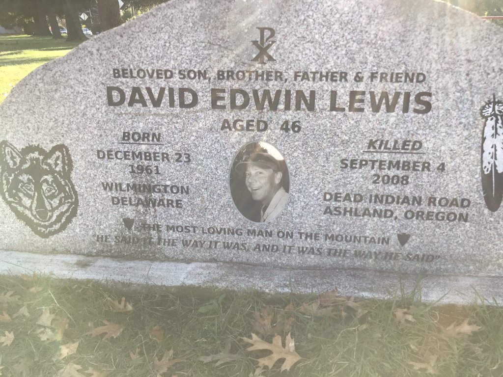 In June 2012, “Fishhook Dave’s” memorial stone was placed against the edge of the bike path along the Greenway and Mountain View Cemetery in Ashland. Standing next to it, one notices the growing birch tree nearby and a spectacular view of the rolling hills off in the distance. The face of a wolf and an eagle’s feather envelopes the words “Beloved son, brother, father, and friend David Edwin Lewis, Aged 46, Born December 23 Wilmington Delaware, Killed September 4, 2008 Dead Indian Road, Ashland Oregon. The most loving man on the mountain. He said it the way it was and it was the way he said.” There is an uneasiness there at the edge of the cemetery where the red winged blackbirds come to rest on the top of the fence, on what should be a sacred and peaceful place, as the community still waits for answers.