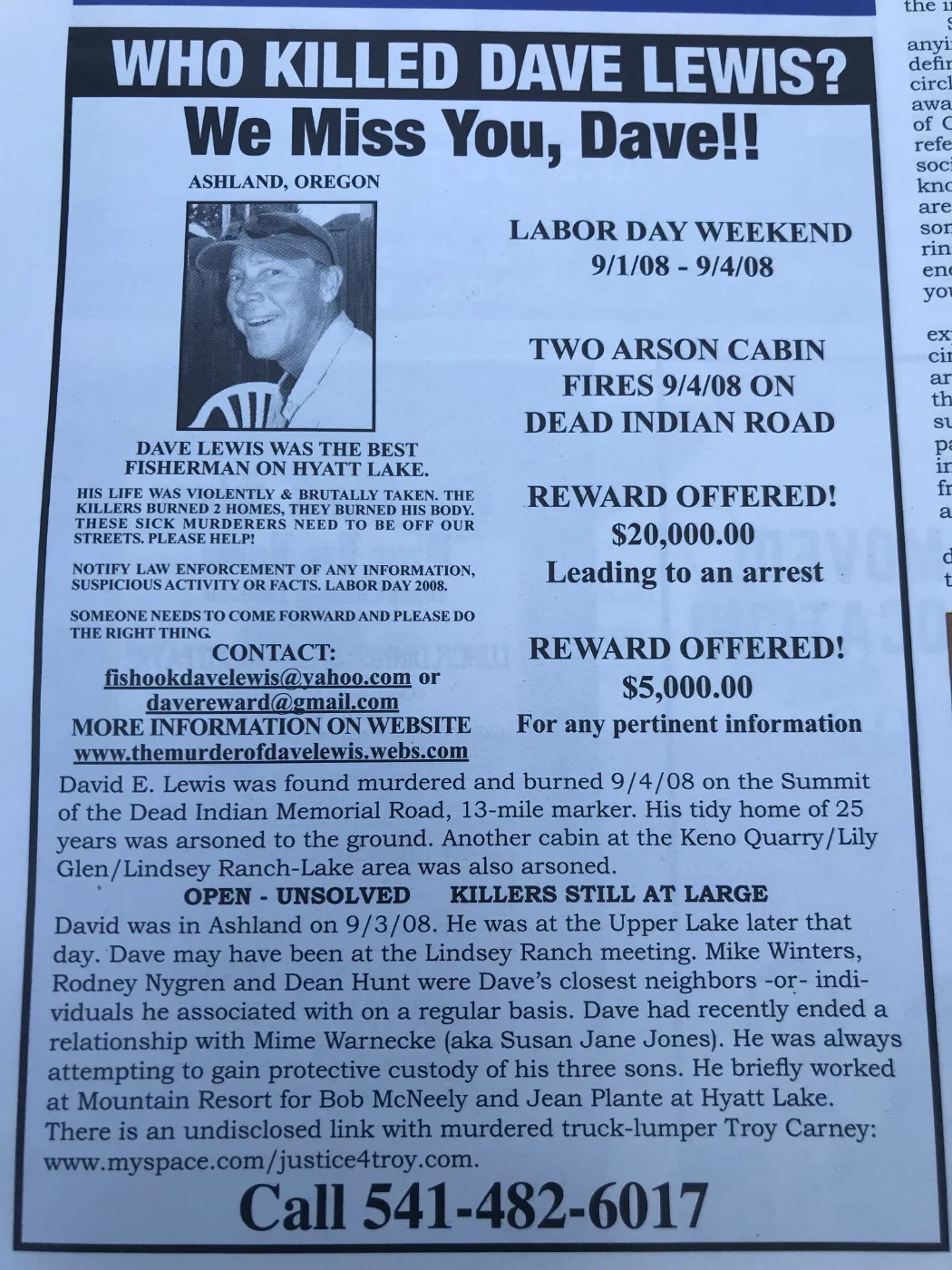 David Lewis was a 46 year old father of three. Dave was well known and well respected in his mountain community where he lived on the summit of Dead Indian Memorial Road, 13 miles east of Ashland, Jackson County, Oregon for more than 20 years.