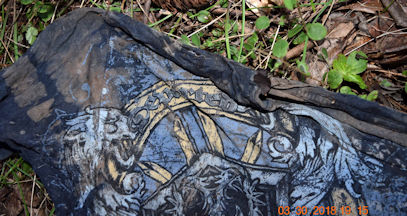 I found a metal band based out of the UK on facebook called "Departed." They didn't have any merchandise that looked like this shirt, nor any albums called The Dark Days, though. The shorts appear to be serious soccer shorts - available in the UK and Australia. The gloves and shoes could be found anywhere. Probably the belt, too. I wish they'd show a picture of the knife.