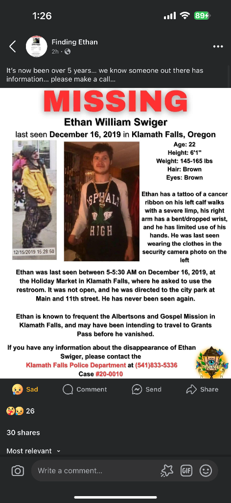 Anyone with information concerning Ethan Swiger’s disappearance is asked to call the Klamath Falls Police Department at (541) 883-5336. To remain anonymous and possibly be eligible for a reward, call the Anonymous Tip Hot Line: (541) 883-5334.