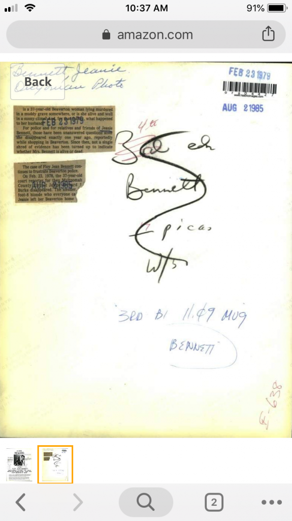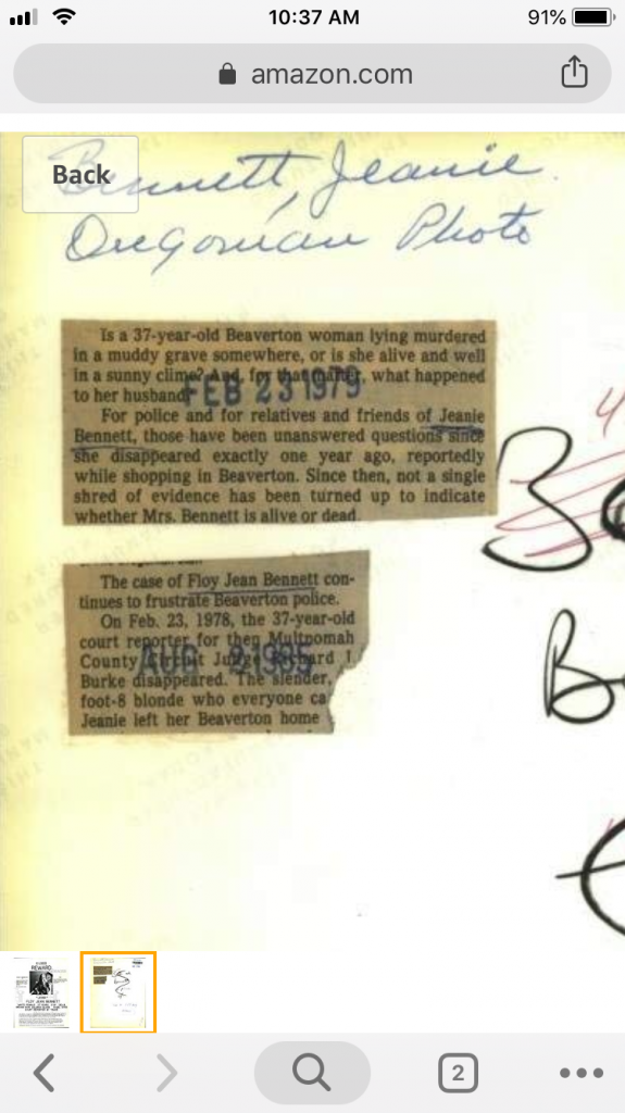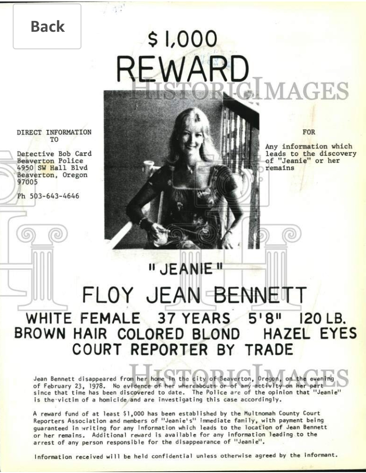 Floy was last seen at her home in Beaverton, Oregon on the evening of February 23, 1978. Her husband, Robert Eugene "Bob" Bennett, said she failed to return home from a shopping trip. She has never been heard from again. The contents of her home and most of a $90,000 inheritance disappeared with her.