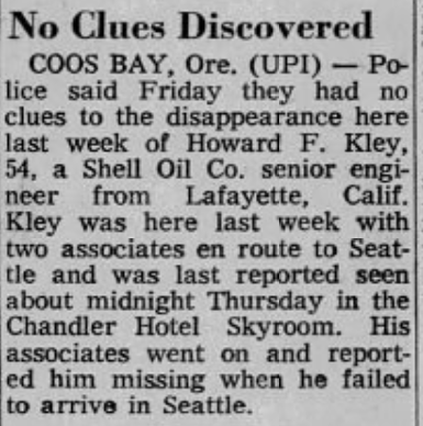 Kley, a senior engineer for Shell Oil, was on a business trip when he went missing on January 26, 1966. He and two business associates had stopped in Coos Bay, Oregon en route to Seattle, Washington.
