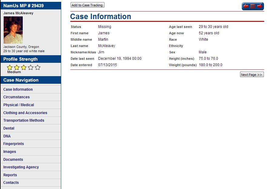 I entered Jim in NamUs, profile is not online yet. We're waiting for a case worker as it looks like Janet Franson is no longer with NamUs.