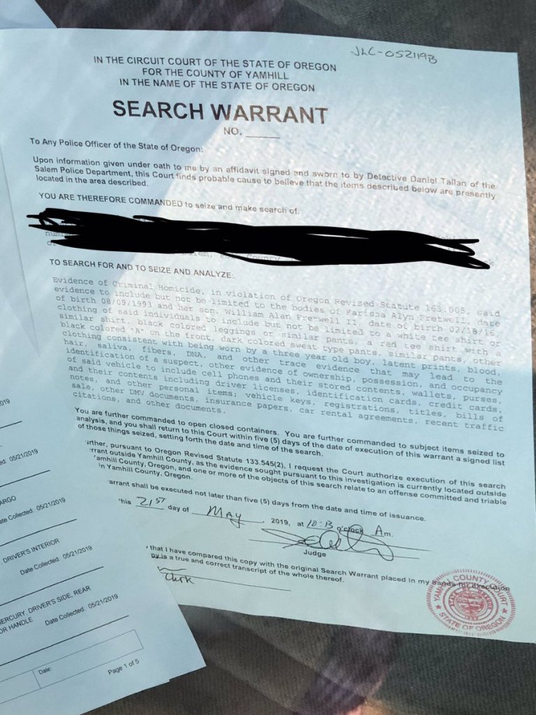 Evidence of Criminal Homicide, in violation of Oregon Revised Statute 163.005, said evidence to include but not be limited to the bodies of Karissa Alyn Fretwell, date of birth 08/09/1993 and her son, William Alan Fretwell II, date of birth 02/18/16, clothing of said individuals to include but not be limited to a white tee shirt or similar shirt, black colored leggings or similar pants, a red tee shirt with a black colored "A" on the front, dark colored sweat type pants, similar pants, other clothing consistent with being worn by a three year old boy, latent prints, blood, hair, saliva, fibers, DNA, and other trace evidence that may lead to the identification of a suspect, other evidence of ownership, possession, and occupancy of said vehicle to include cell phones and their stored contents, wallets, purses, and their contents including driver licenses, identification cards, credit cards, notes, and other personal items, vehicle keys, registrations, titles, bills of sale, other DMV documents, insurance papers, car rental agreements, recent traffic citations, and other documents.