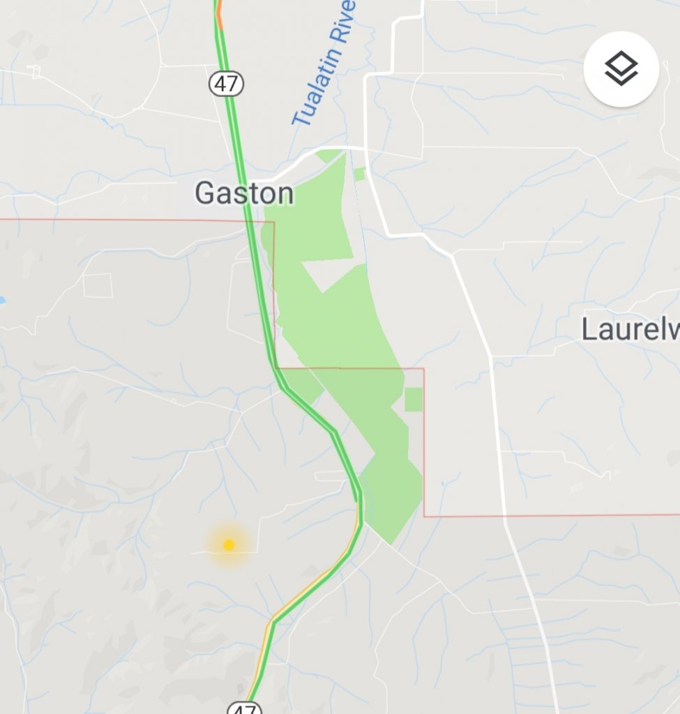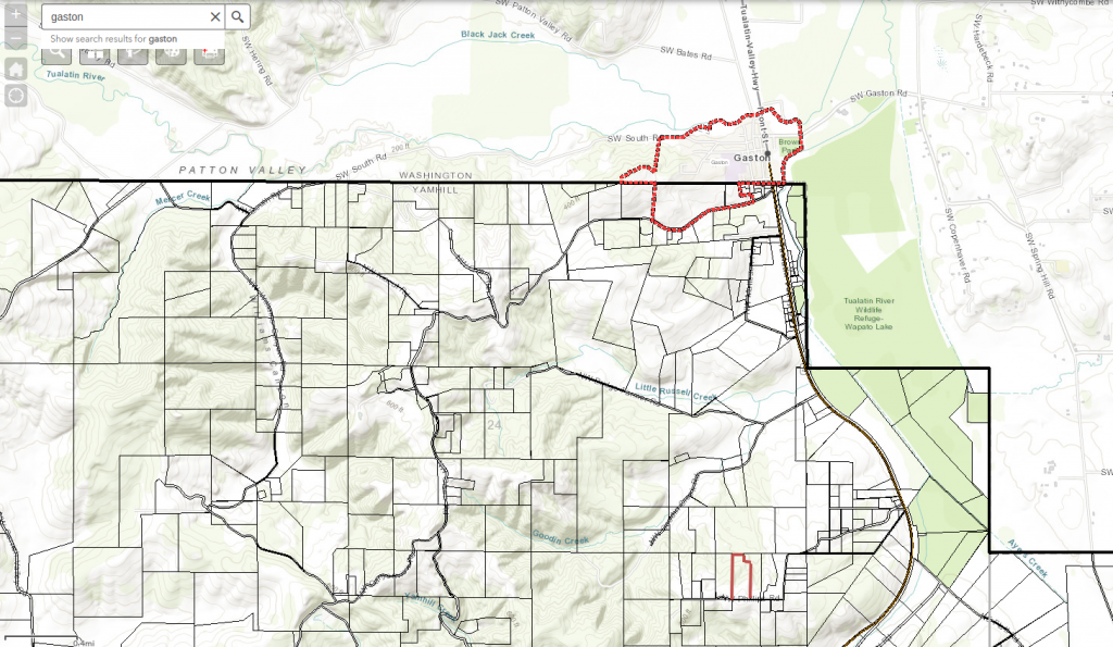 Simple county map. Gaston is up near hwy 47 and residents can be on the Washington or Yamhill side