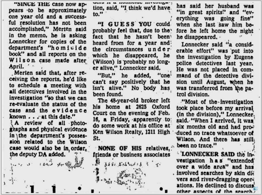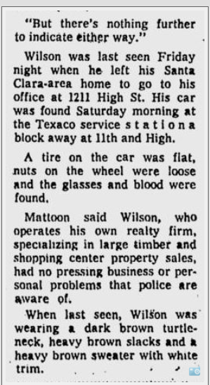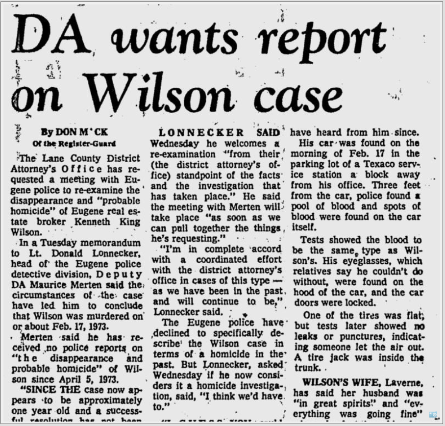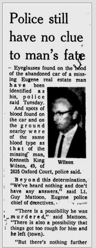 Brief synopsis: The owner of McCabe's Texaco station noticed Kenneth Wilson's car disabled at the service station when opening up his business at 7 a.m. on February 17, 1973. A pool of blood and prescription eyeglasses were observed near the vehicle. Upon investigation by police, it was determined the registered owner of the car, Kenneth Wilson, was assaulted and kidnapped. His body has never been found.