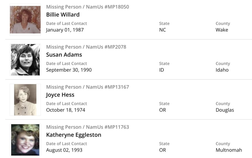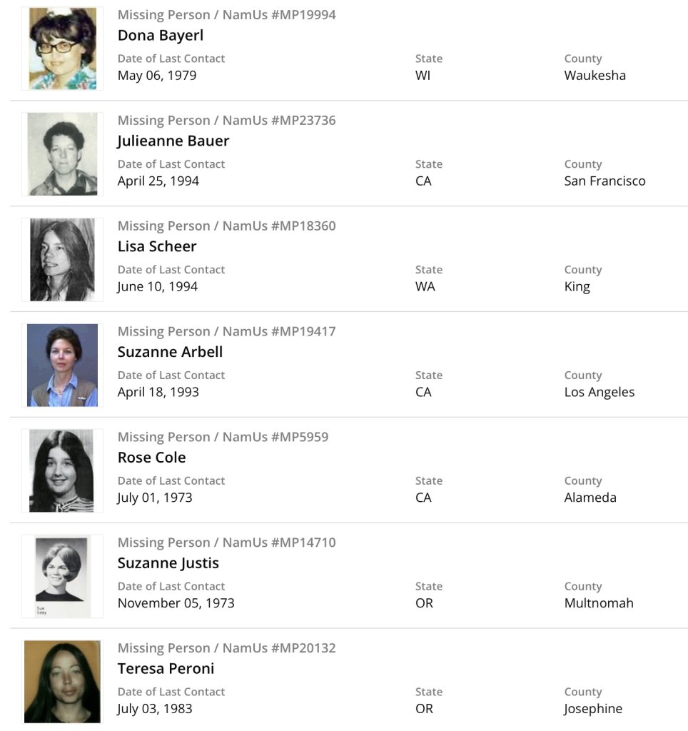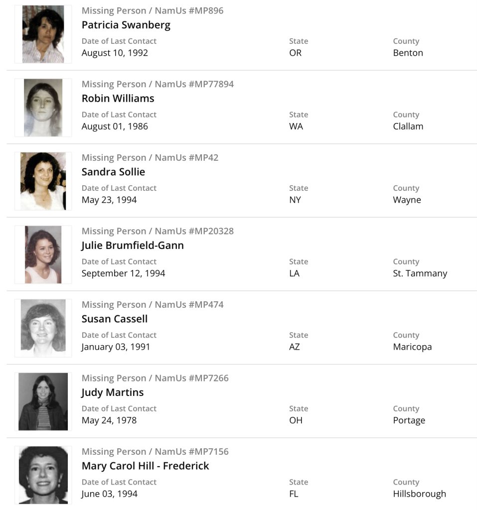 18 Missing Person Exclusions + Barbara Siegal (not listed on NamUs) per post #42
