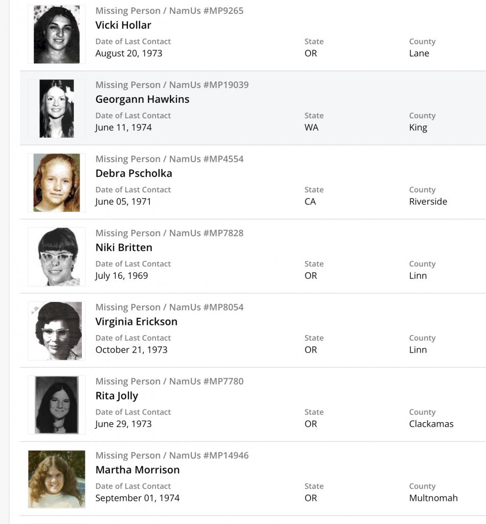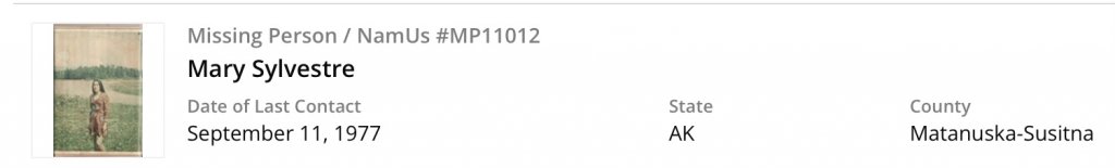 Missing Persons who are Native American and Female, from NAMUS. Possibly matching the timeframe. Native not based on personal effects, but the race/ethnicity information stated.