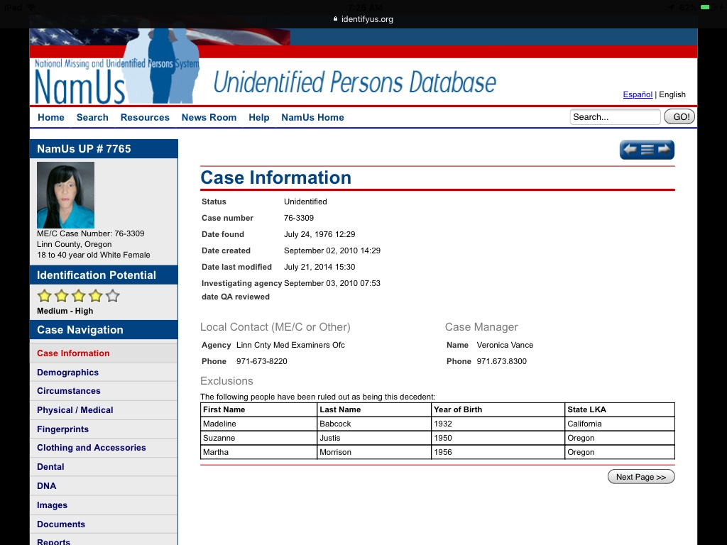 Here's another mid-1970's Female MP from Oregon just added to NamUs who fits the description of the 1976 Linn County Jane Doe.