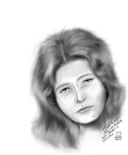 gonna iterate that im going based off facial features. i think she may look different probably due to the angle at which the sketch was made from.