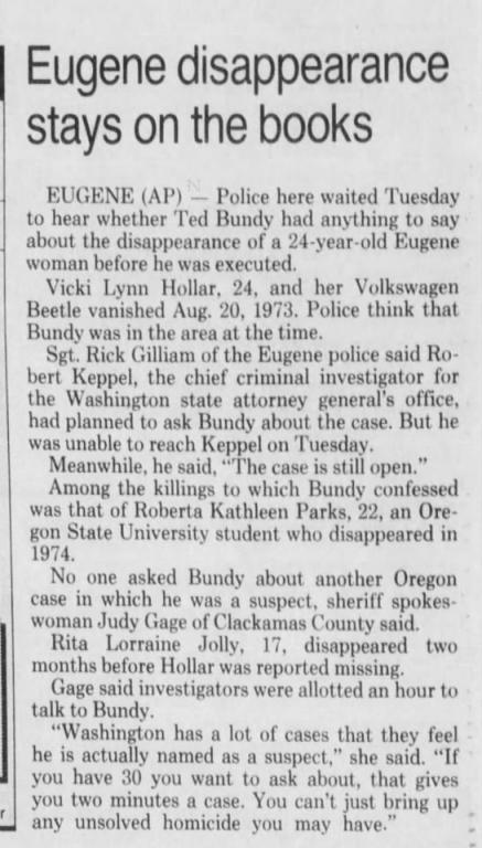 Vicki Lynn Hollar was last seen on August 20, 1973 entering her car, a black 1965 Volkswagen Beetle with Illinois license plate GR 7738, with the running boards removed, at a parking lot at 8th Avenue and Washington Street at about 17.00.