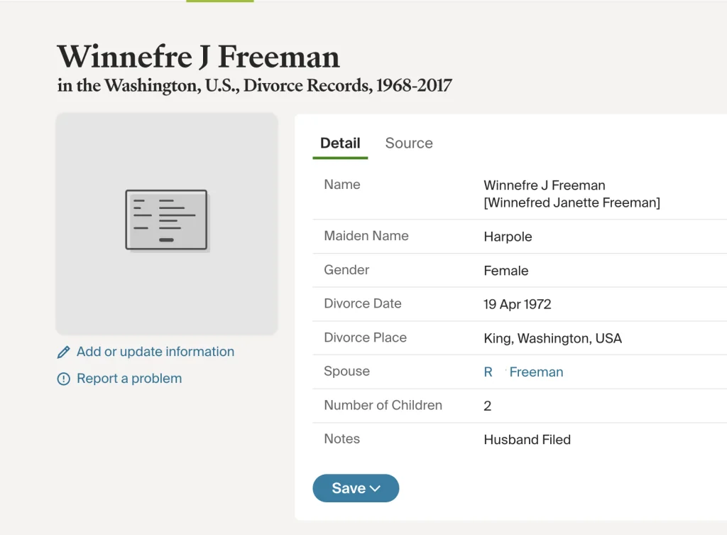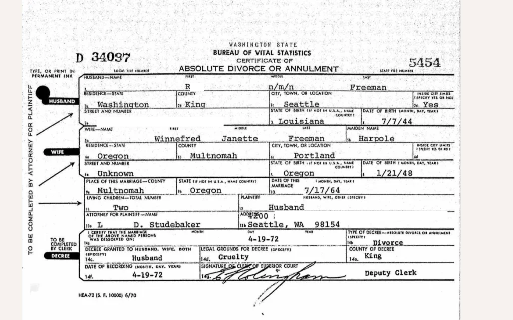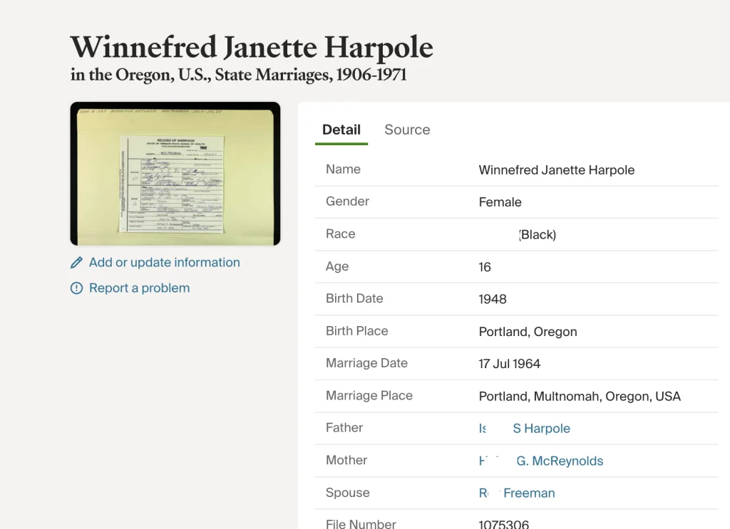 I think Freeman was a married name, because it changed in 1965 from Harpole to Freeman. She is also referred to as Mrs. Freeman, instead of Miss Harpole in the paperclipping. Oregon's birth and mariages are not public (yet?) so I couldn't find her on My Heritage.