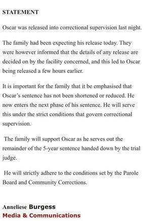 Sky News reports that OP will meet the requirements of his parole BUT what exactly are they. Anneliese Burgess was unable to say and was unable to add anything to what we already know. This is a joke. She says Oscar's sentence continues. I wonder how many prisoners live in 5 star luxury whilst waiting out their sentence. Something "smells" about all this but, hey ho, that is nothing new where OP is involved.