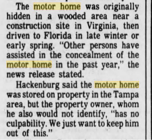 A 30-foot-long motor home which was owned by the couple was discovered missing around the same time Mrs. Groomes disappeared. The husband told police that he believed his wife had driven the mobile home west and joined a cult.