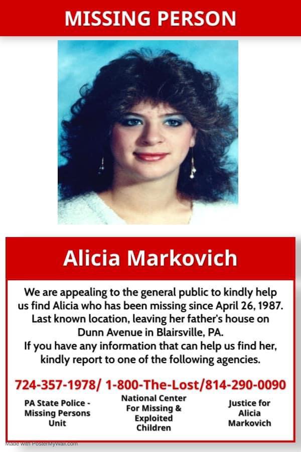 ALICIA MARKOVICH Missing: Apr 26, 1987 BLAIRSVILLE, PA