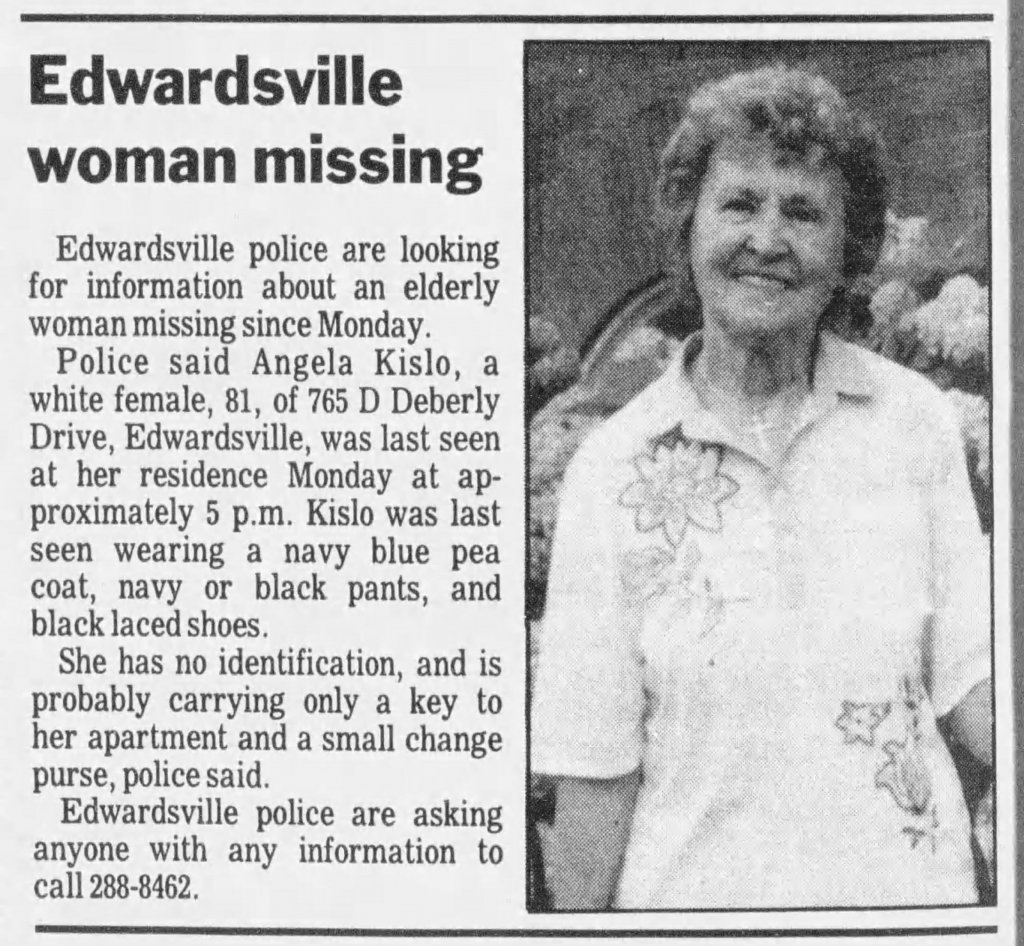 Kislo was last seen in Edwardsville, Pennsylvania on April 16, 1996. She left her residence at Gateway Manor with a prayer book and her apartment key, and has never been heard from again. It's uncharacteristic of her to leave without warning or without taking her purse, which was left on the floor of her apartment. $200 in cash, and her identification, was also left behind.