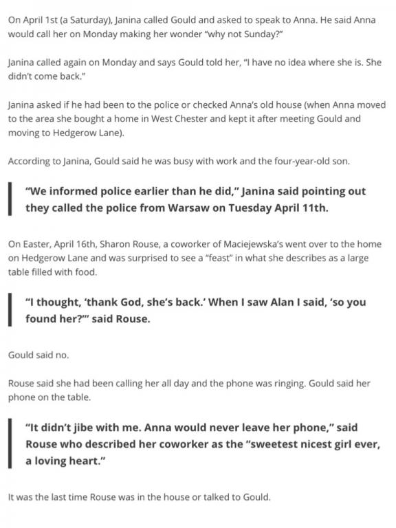 It is always possible that a prosecutor might be game for a trial without a body but I don't think that will be the case at all. Pennsylvania, and the Pennsylvania State Police in particular, are quite content to wait decades before finally going after someone. Right now, as I see it, there are two possibilities. One possibility is that cadaver dogs hit on either the home or a vehicle and LE is trying to determine if there is a co-conspirator. The other is that there was no hit by cadaver dogs in the home or the vehicles and there is certainly a co-conspirator. As it is, even if Anna is found it is quite likely that how she was killed (I do believe she is dead) will not be able to be determined. What is important about this case is that the victim and the people around her are educated and are not a collection of half-wits. That said, I believe only one of the people involved was smart enough to keep a "get out of life without parole" card as an insurance policy. As for the other person, I believe she, since I believe there is a woman involved, is completely screwed.