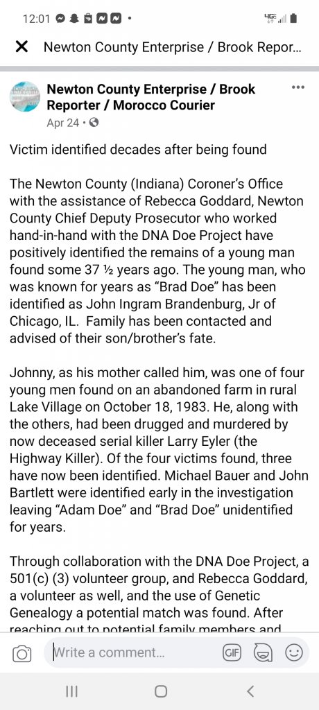 Bryan was last seen leaving his home on February 21, 1983 to go fishing. Bryan has not been seen or heard from since that time. He has a scar on his right hand between his ring and middle finger, a tattoo of a cross on his right arm, and a tattoo of a skull, which may have been changed to a rose, on his upper left arm. Bryan's nicknames are Bry and Fish.