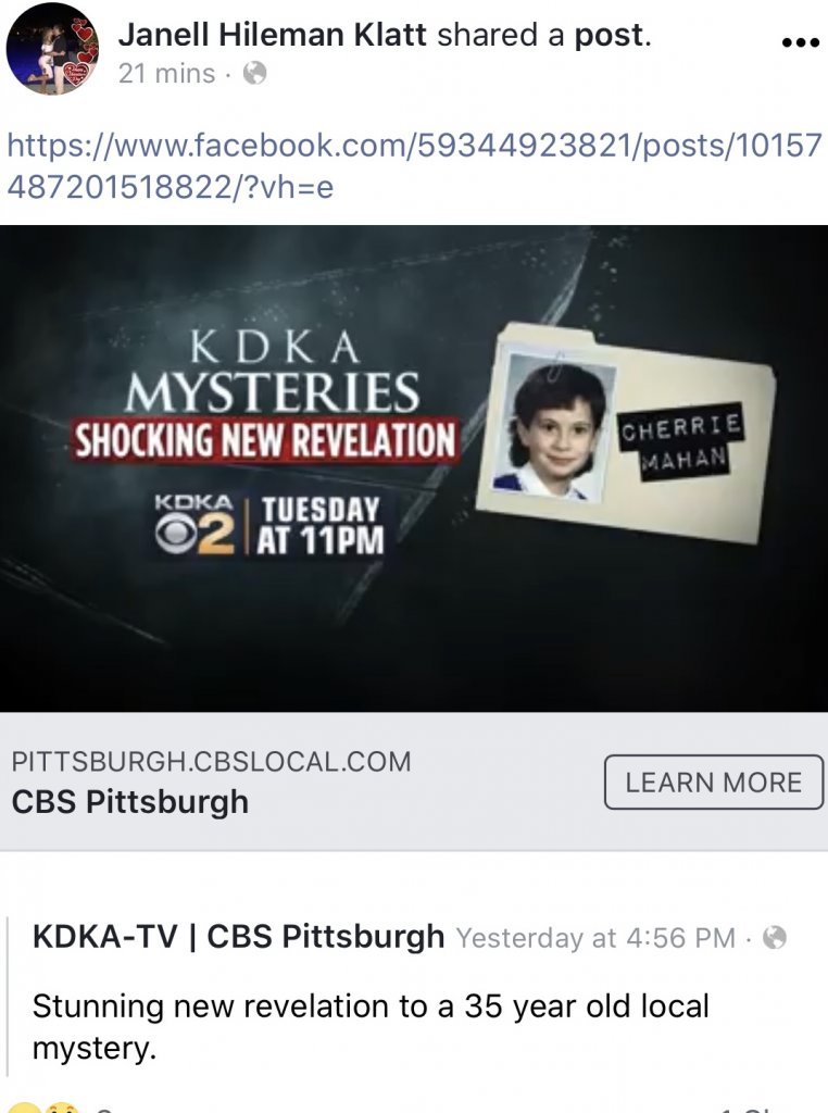 Cherry’s mom will be on KDKA Tuesday @11:00 p.m.