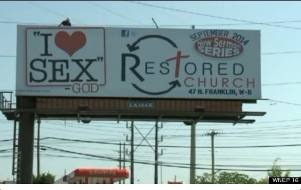 'Restored Church of Wilkes-Barre, PA paid for a billboard along Route 309 that reads "'I love sex.' -God" and promotes the church's new sermon series that will focus on the biblical Song of Solomon.