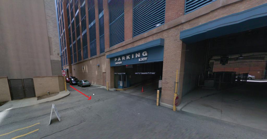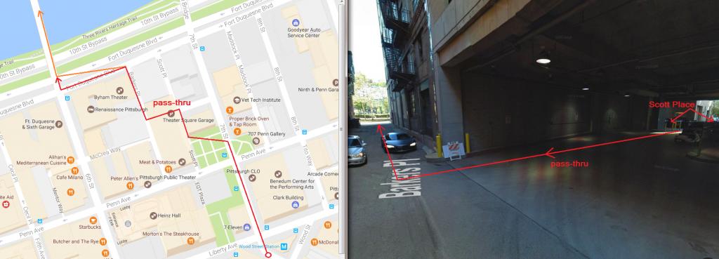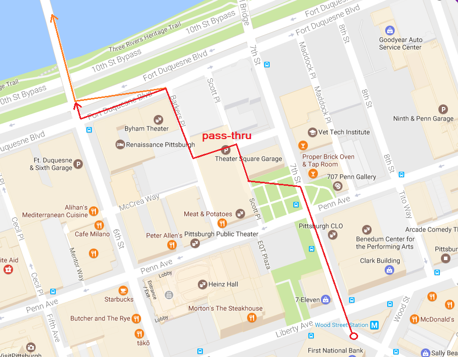 That path would take him right past the entrance/exit of the parking garage and if he continued straight past that it would take him to Fort Duquesne Blvd.